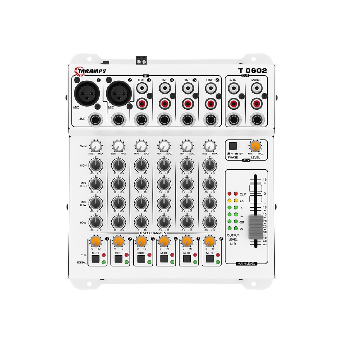 Com a mesa de som T 0602, você pode controlar e mixar o seu sistema de som com muito mais tranquilidade e simplicidade. Os seis canais de entrada, com 16 conexões permitem diversas possibilidades de mixagem, dentre elas estão: microfone, players, instrumentos musicais (ex: teclado e violão), e etc. Com ajuste de ganho e Level em todas as vias, possibilita que sua estrutura de ganho fique impecável. Além disso, para dar aquele toque especial na ?regulagem?, todas as vias possuem equalização tonal em 4 faixas (graves, médios graves, médios agudos e agudos). E não poderia faltar a indicação visual de cada um dos canais com leds de On, Clipping e Sinal, contando ainda com V.U. de saída onde poderemos garantir mais volume de som sem as indesejadas distorções, garantindo baixíssimo nível de ruídos ou chiados. Através dos dois canais de saída, podemos enviar sinal de áudio para periféricos como equalizadores, processadores de áudio ou diretamente para os amplificadores. Também é possível utilizar a saída auxiliar para enviar áudio para outros sistemas, possibilitando controlar o volume e ajustar fase, corrigindo possíveis cancelamentos. T 0602, qualidade e controle ao seu alcance. Resposta de Frequência (-3dB): 2Hz ~ 76Khz